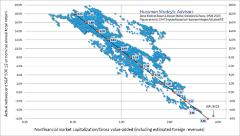 The Fed's immense injection of liquidity into the economy has caused asset prices to rise well above normal valuation levels. The price you pay for an asset determines the return you’ll earn. The chart below estimates negative 6% per year returns for the next 12 years for the S&P 500. That estimate is based on actual past returns associated with prior Mkt Cap/Gross Value Added levels.