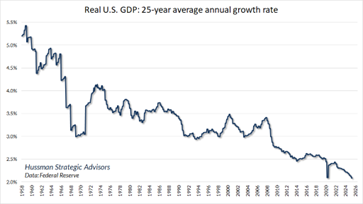 Whenever one mentions AI, the central focus of investors seems to be on visions of enormous future corporate profits and ever-accelerating economic growth. I think that exuberance will prove to be off the mark. Consider the profound impact of the internet, smartphones, social media, the sequencing of the human genome, and all of the life-changing technologies of the past 25 years. One might imagine that economic growth over the past 25 years must have been higher than over any 25-year span in history. In fact, it is the lowest.