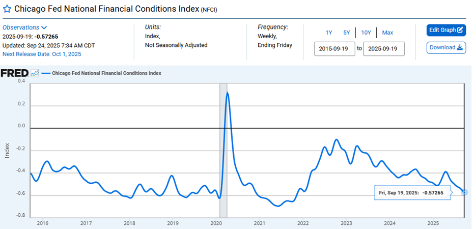 Financial conditions remain loose. (Negative numbers mean looser than average financial conditions. The NFCI is currently negative 0.57).