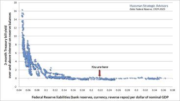 Short-term interest rates will go up or down because the Fed changes the rate of interest it pays banks to hold those reserves. As you can see from the “liquidity preference” curve we discussed earlier (chart above), the Fed’s balance sheet would have to shrink well below 10% of GDP before market forces alone could keep interest rates above zero. Prior to QE, the historical norm was about 6-8% of GDP.