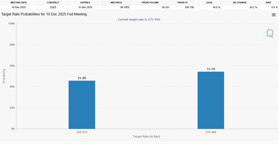 - The odds that the Fed will cut a quarter-point on December 10th fell to 45.8%