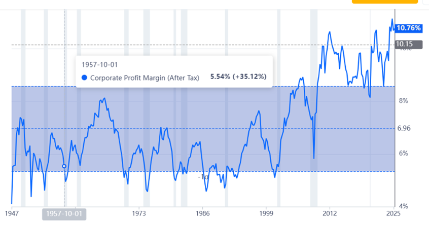As well, the economy seems to be growing above trend. The Atlanta Fed GDPNow tool is estimating 3.8% real GDP growth for Q3. Analysts project 6.4% annual sales growth for the S&P 500 from the end of 2025 through 2027, according to FactSet. Analysts expect earnings growth of 14% over that period. Earnings growth outpacing sales growth implies higher margins, which is unlikely. Margins are already at record highs.